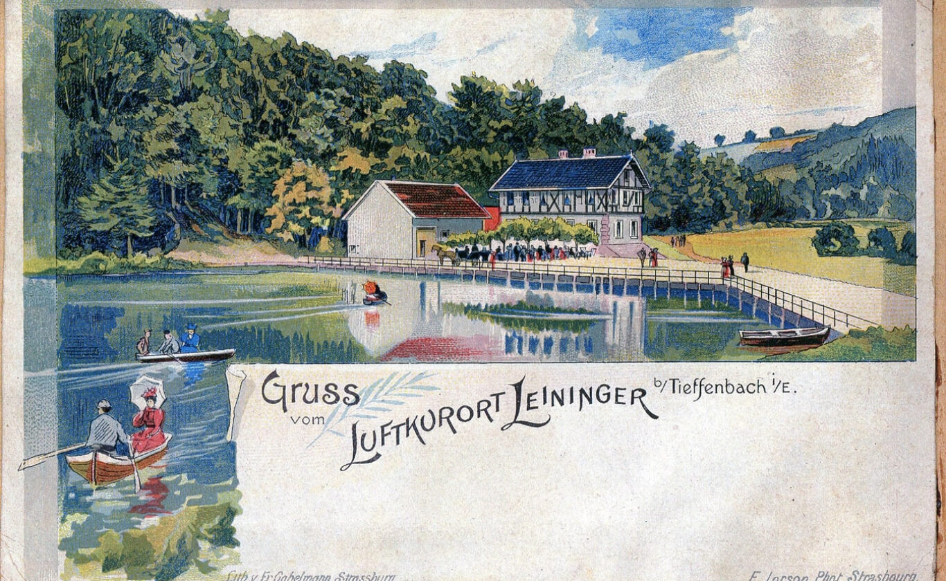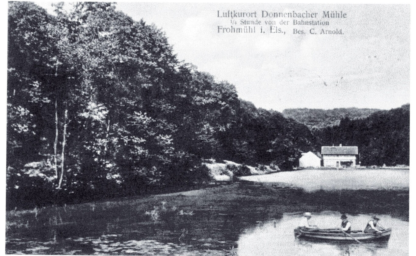 Modeste centre d’accueil, station climatique, « Luftkurort », avec ses premières cartes postales et publicités sur le site, canotage sur l’étang. La grange est construite vers 1910 pour un nouveau projet qui n’aboutit pas.