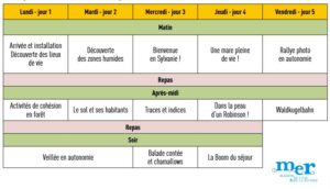 En sélectionnant parmi les thématiques ci-dessus, chaque enseignant peut composer un programme pour une journée ou un séjour adapté à ses objectifs. Nous restons également à l’écoute de demande plus spécifique. N’hésitez pas à nous contacter.