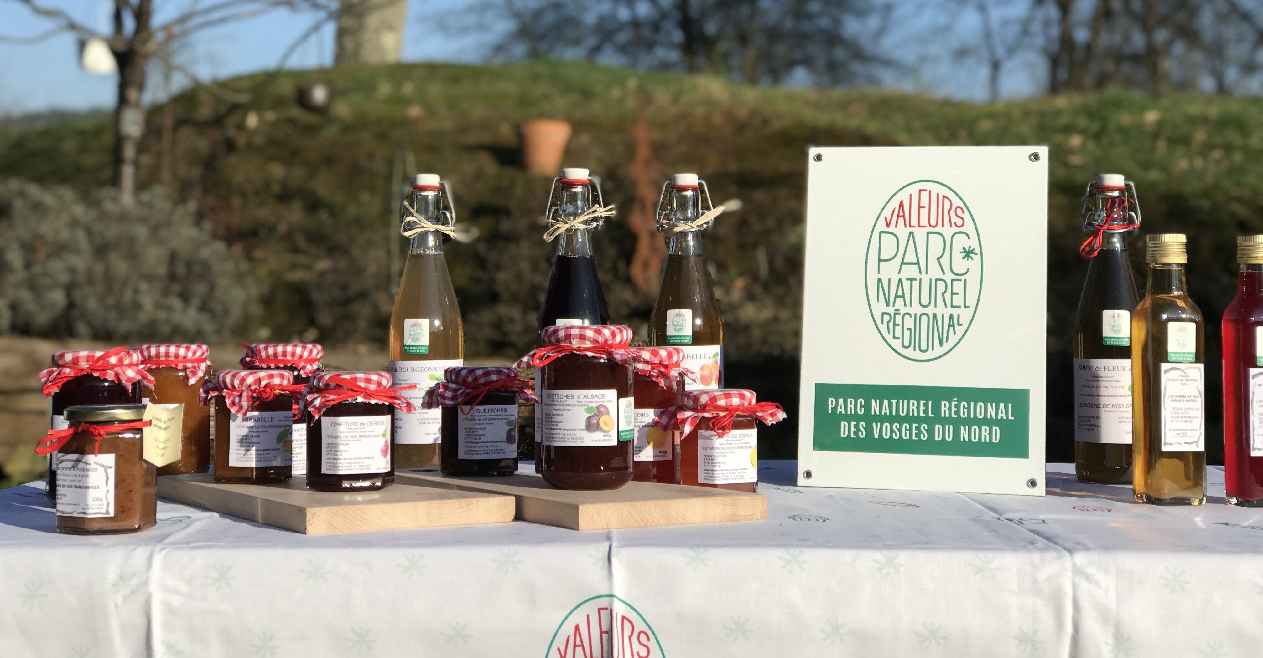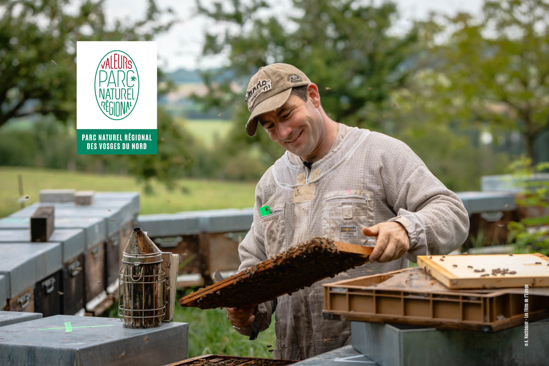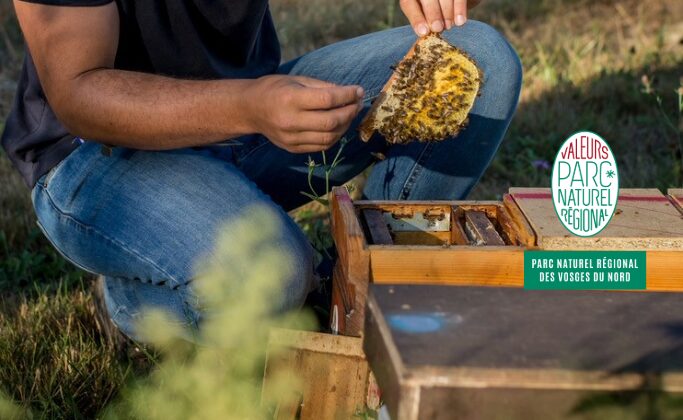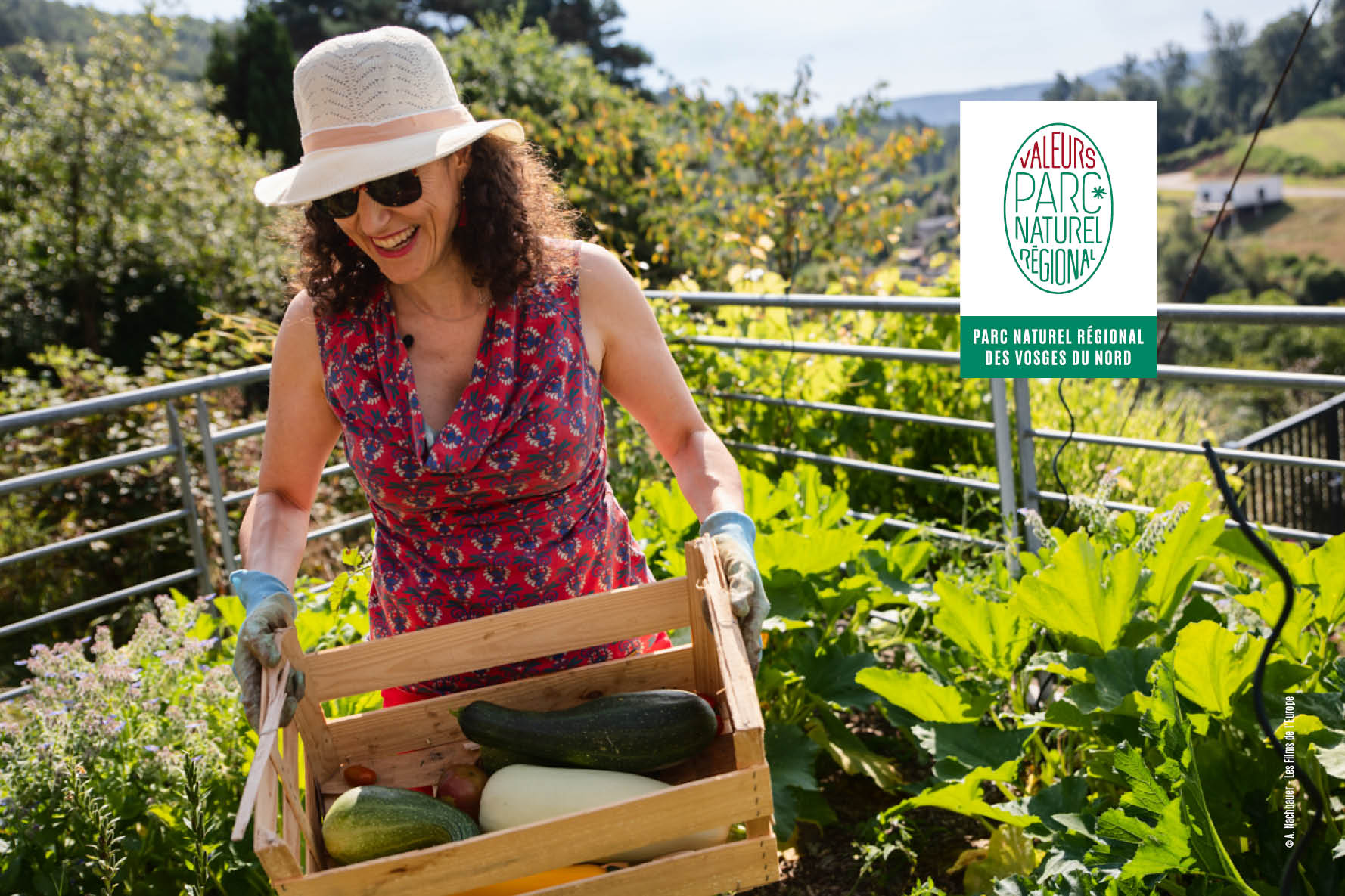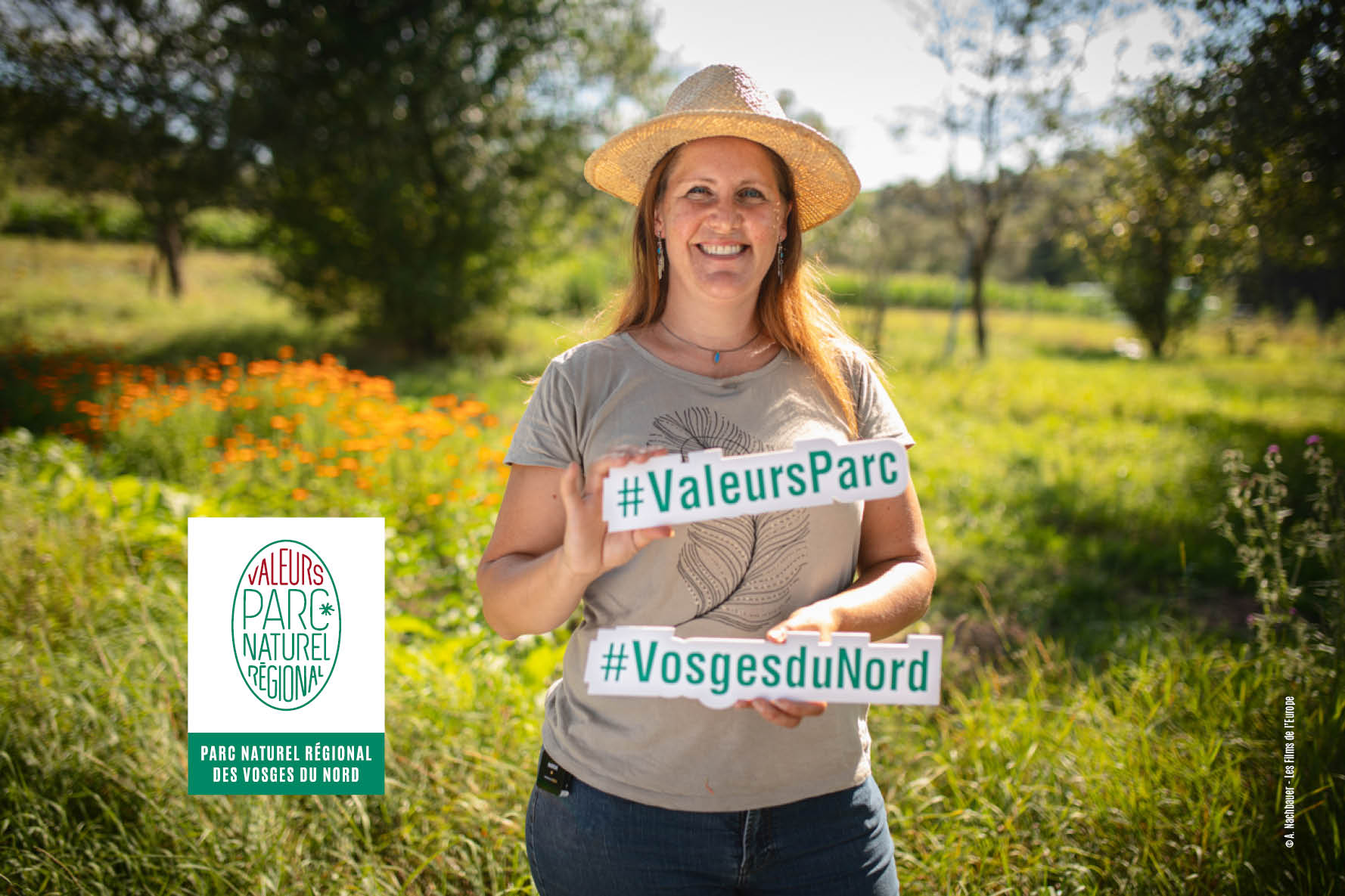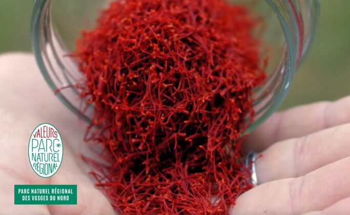 Une personne tient une poignée de filaments de safran rouge versés dans un récipient en verre, avec un logo du Parc Naturel Régional des Vosges du Nord visible sur l’image.