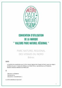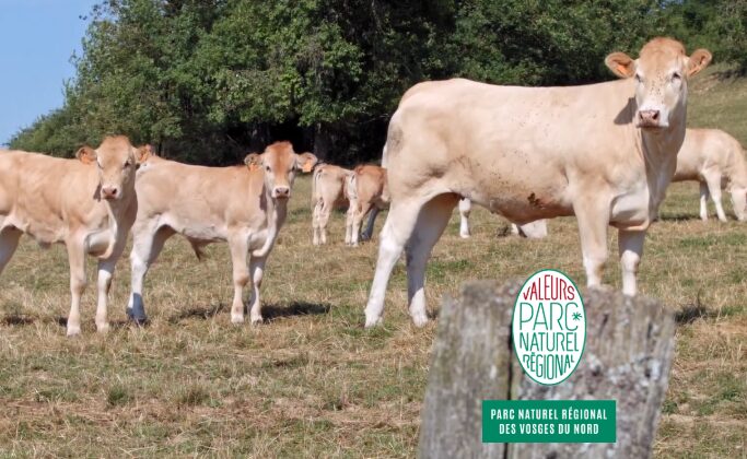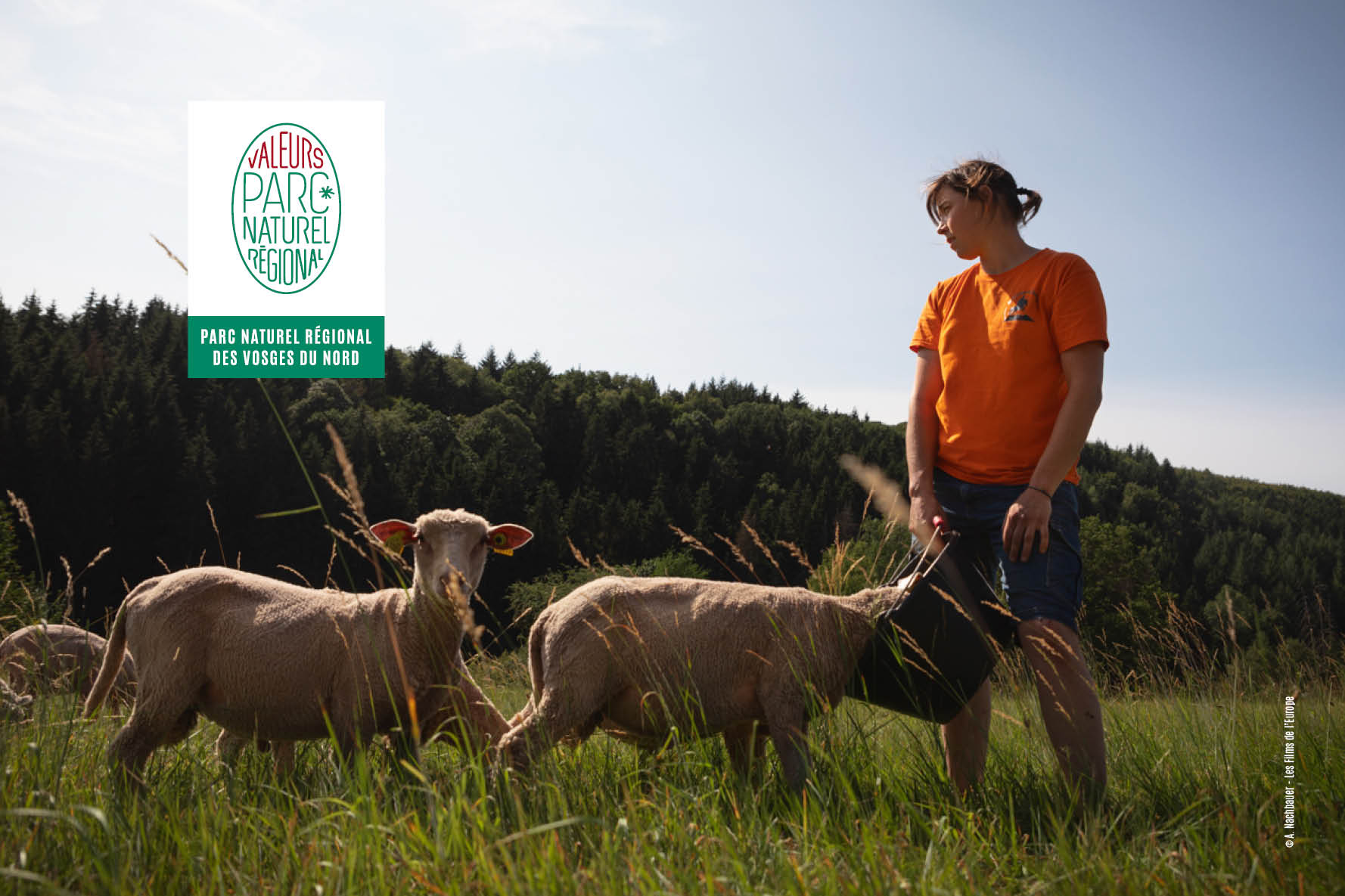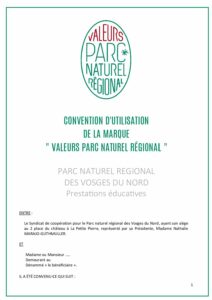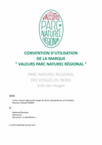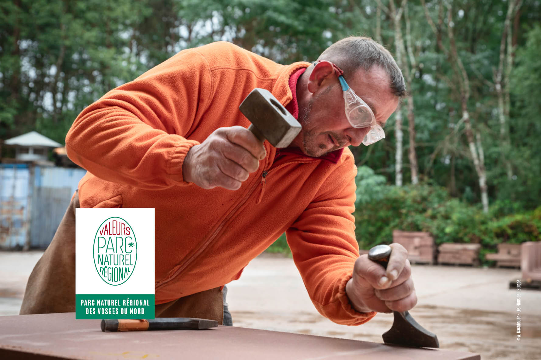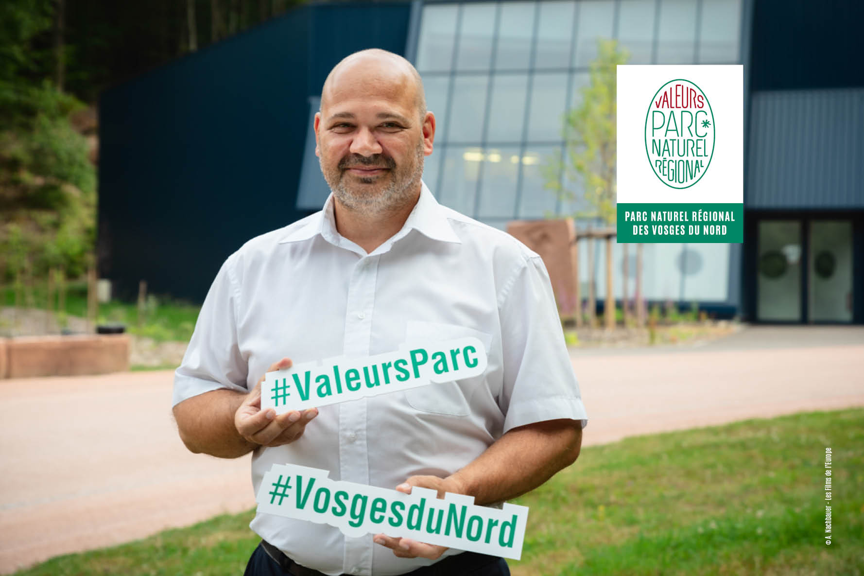 Une personne tient une poignée de filaments de safran rouge versés dans un récipient en verre, avec un logo du Parc Naturel Régional des Vosges du Nord visible sur l’image.