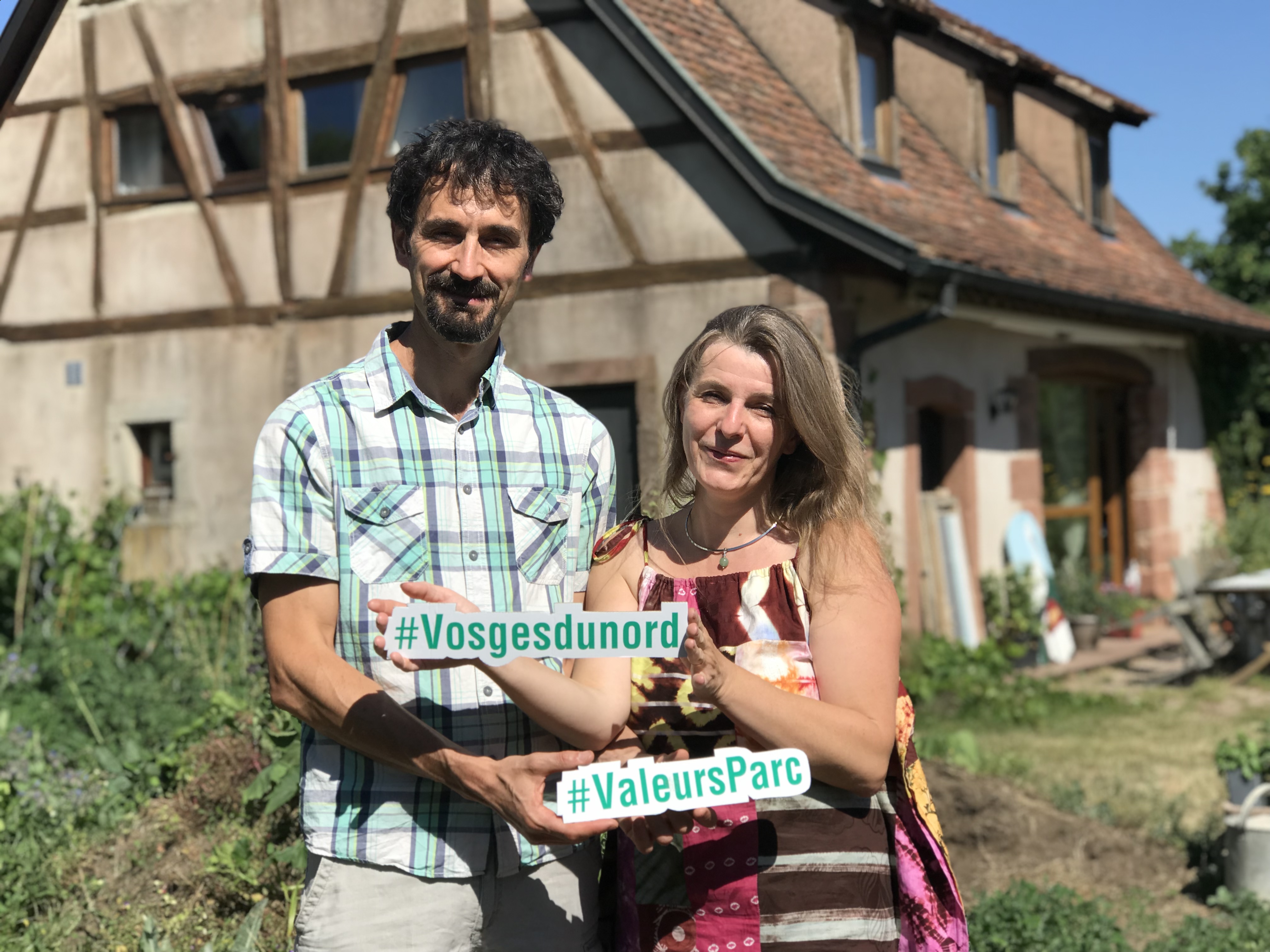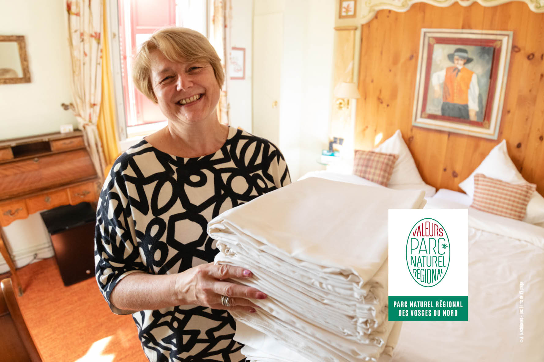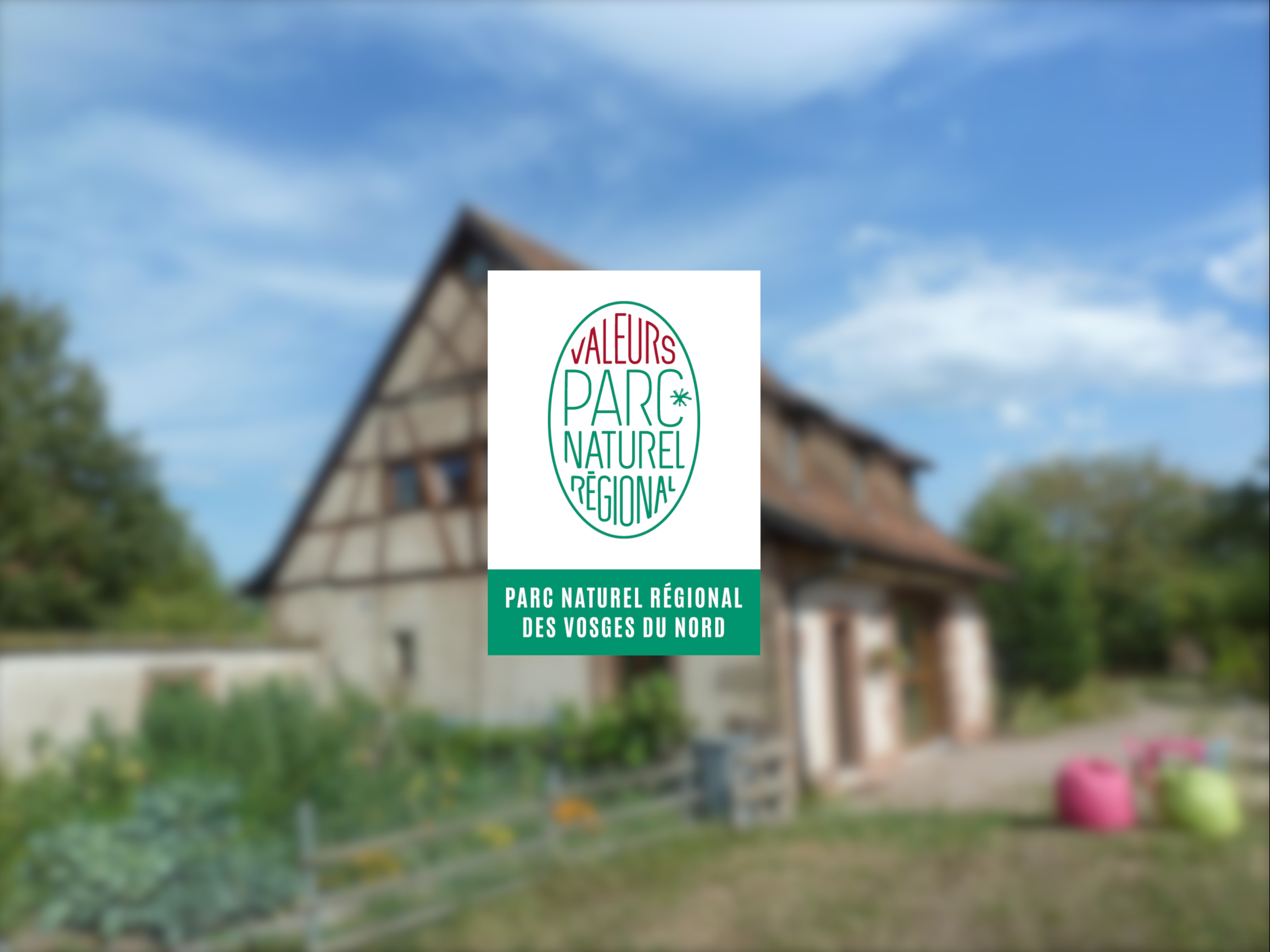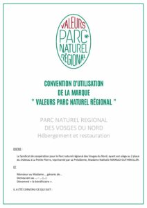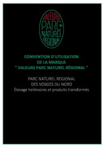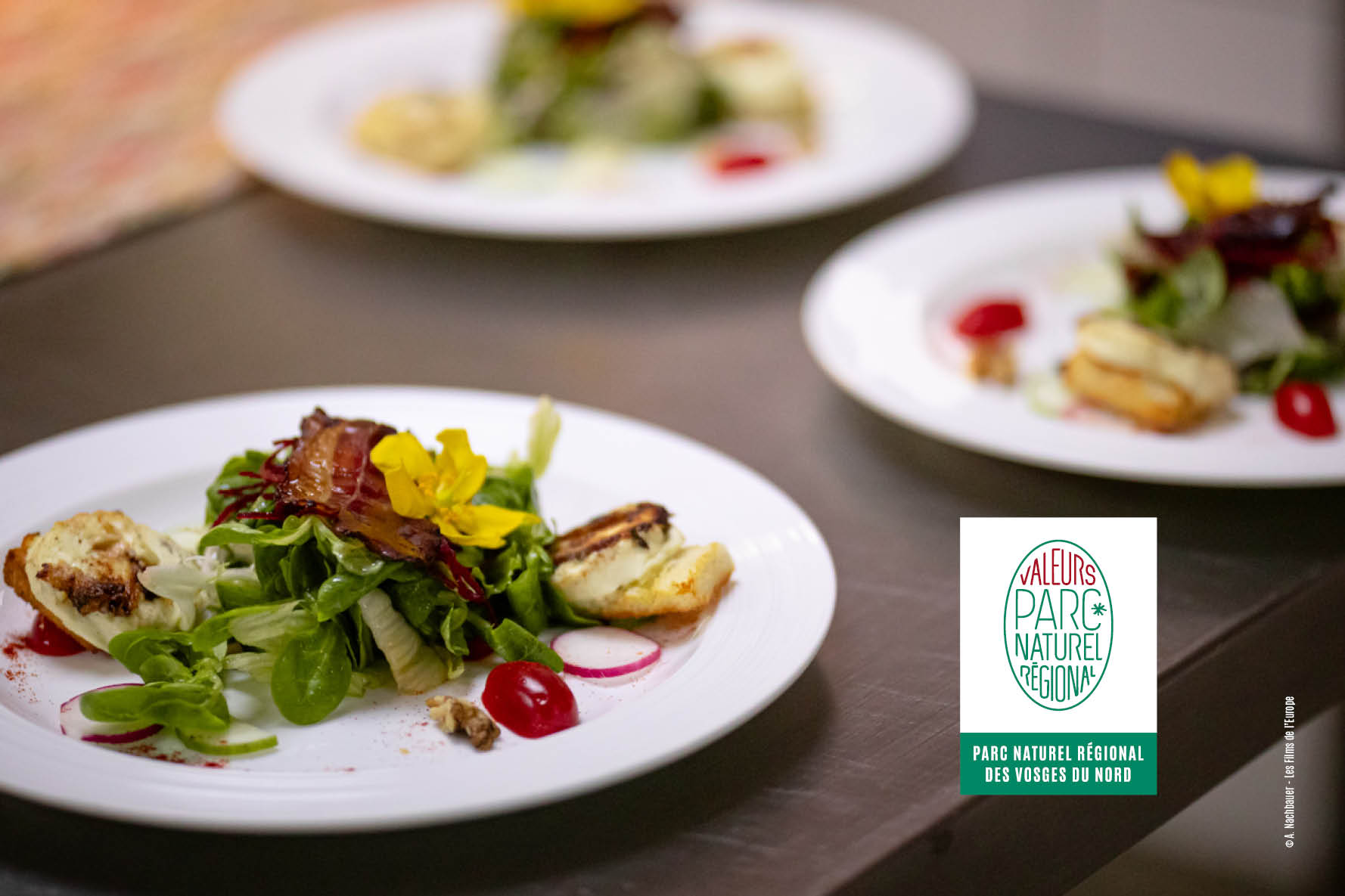 Une personne tient une poignée de filaments de safran rouge versés dans un récipient en verre, avec un logo du Parc Naturel Régional des Vosges du Nord visible sur l’image.