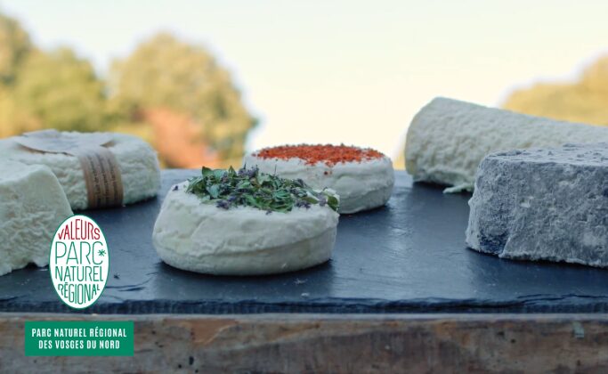 Une variété de fromages artisanaux, certains agrémentés d’herbes ou d’épices, sont présentés sur une ardoise noire en plein air, avec des arbres en arrière-plan.
