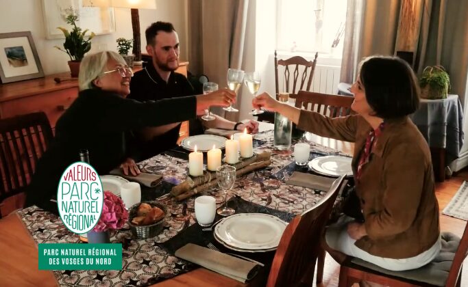 Trois personnes sont assises autour d’une table dressée pour un repas, levant leurs verres pour trinquer. La table est décorée de bougies et d’un chemin de table en dentelle.